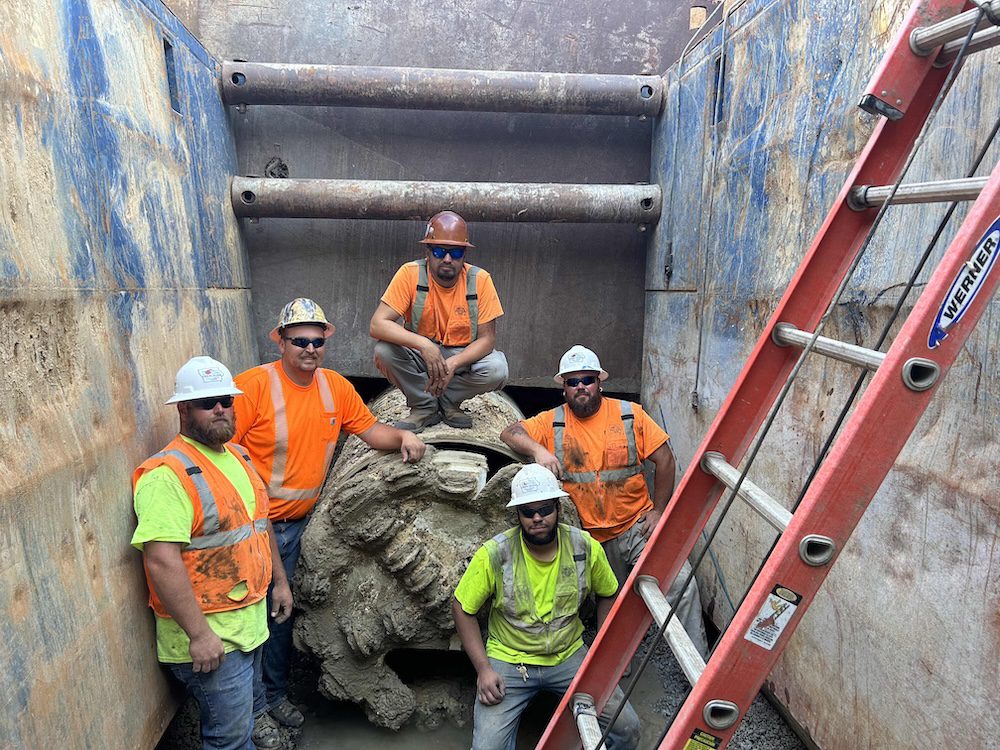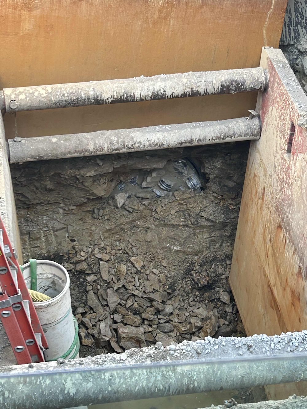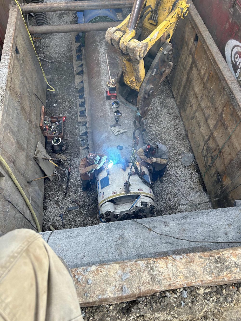 Foreman Kyle Spoon and his team — Alex Tapley, Dustin Olson, Jakob Janssen, and James McAtee — completed the first bore in soft ground as anticipated. However, excavation for the second and third bores revealed limestone bedrock directly within the bore path. Because the bores passed beneath box culverts draining into the Cedar River, raising the elevation was not an option.