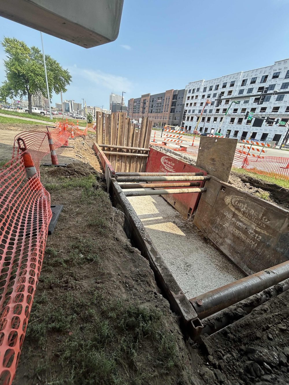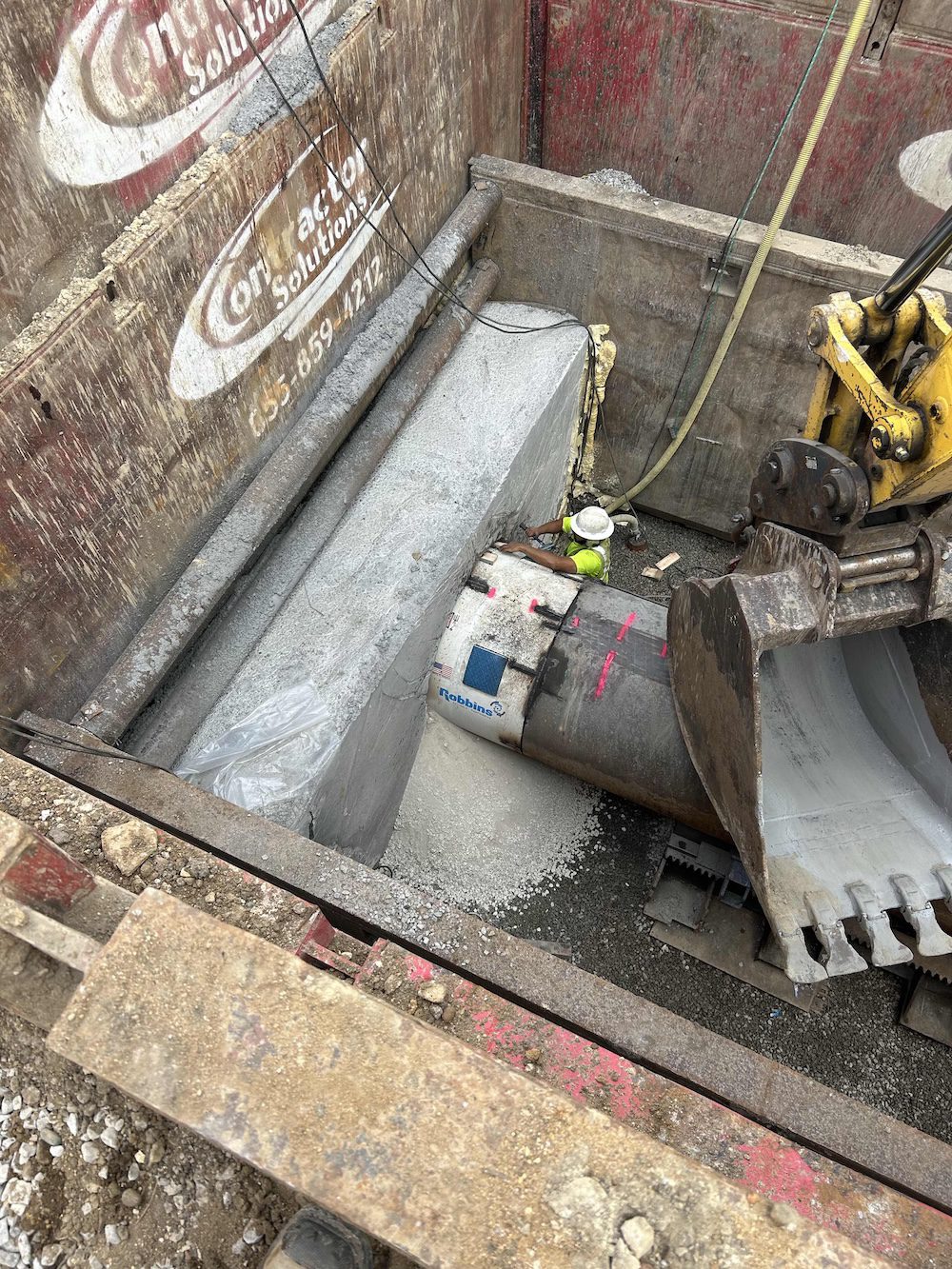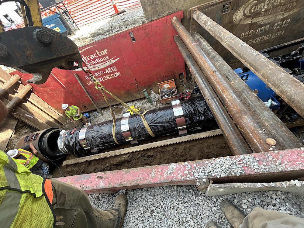 Foreman Kyle Spoon and his team — Alex Tapley, Dustin Olson, Jakob Janssen, and James McAtee — completed the first bore in soft ground as anticipated. However, excavation for the second and third bores revealed limestone bedrock directly within the bore path. Because the bores passed beneath box culverts draining into the Cedar River, raising the elevation was not an option.