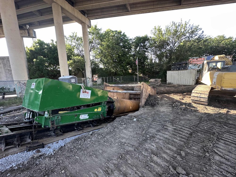 In Fort Worth, Iowa Trenchless provided critical trenchless support on a three-mile, 36-inch HDPE sanitary sewer force main installation that included two major HDD crossings requiring steel conductor casings. When drilling conditions demanded a stabilized entry point, Iowa Trenchless was called in to install two large-diameter pneumatic pipe-rammed casings: