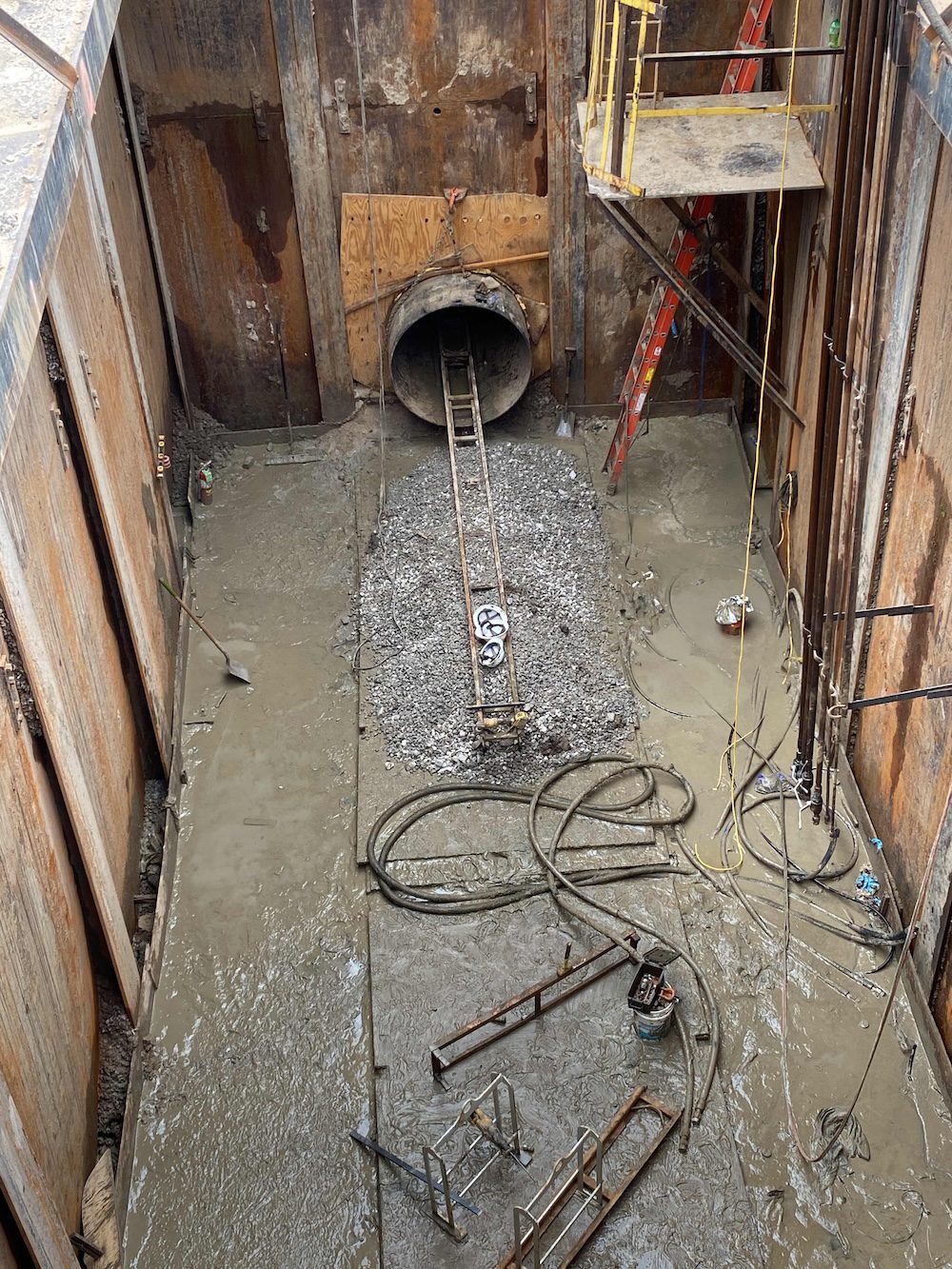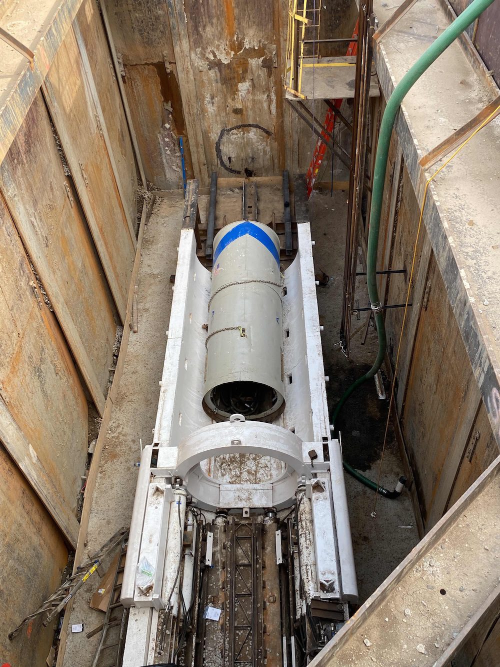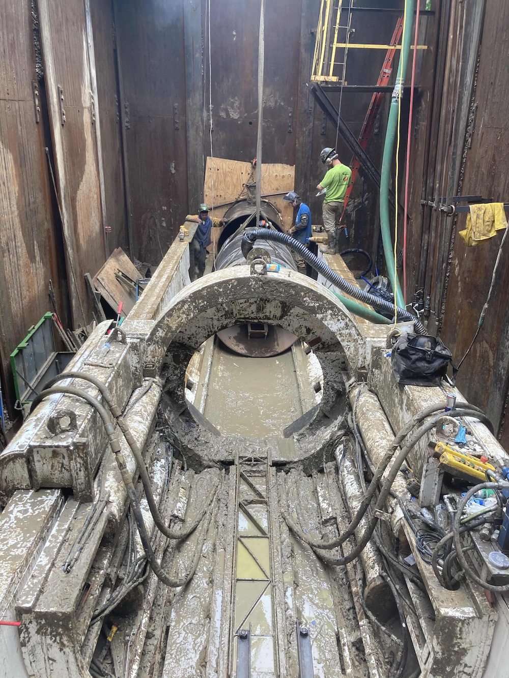 The original design called for a 570-foot soft-ground tunnel. However, supplemental geotechnical exploration revealed a significant bedrock knoll between the launch and receiving shafts. To keep the project viable, the tunnel was realigned and extended to 640 feet.